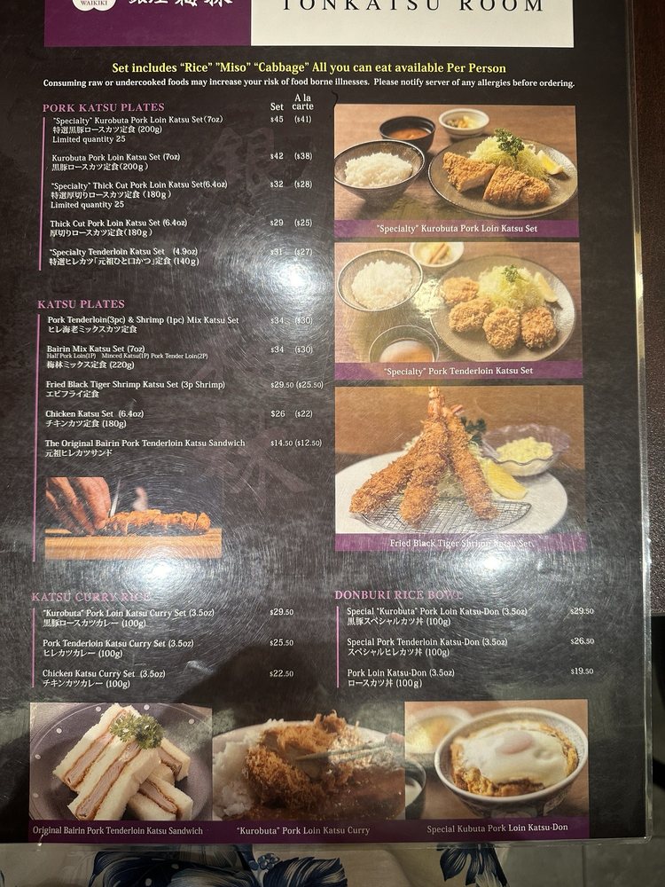 Ginza Bairin Tonkatsu & Yoshoku Bistro in Honolulu offers a diverse Asian fusion menu with a focus on Japanese comfort food. Located at 255 Beach Walk, this bistro provides various dining options, including takeout, delivery, and outdoor seating. Customers rave about the Bairin Special Pork Tenderloin KatsuDon and the Kurobuta Pork Loin Katsu set. Reviews highlight the exceptional quality of the food, with mentions of crispy tonkatsu, flavorful sauces, and fresh ingredients. The cozy ambiance and accommodating service make it a popular choice for both locals and tourists. With a commitment to sustainability and a range of payment options, Ginza Bairin promises a unique dining experience that captures the essence of Japanese cuisine.